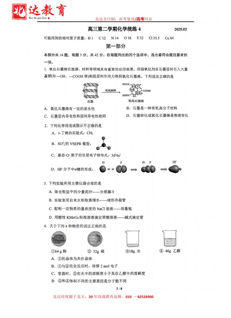 小编给大家搜集整理了北京清华附中2025高三(下)统练四化学试题及答案,需要的小伙伴赶紧下载练习起来吧: 北京北达全日制学校,中高考复读,外地回京中高考 电话咨询:400-6168…