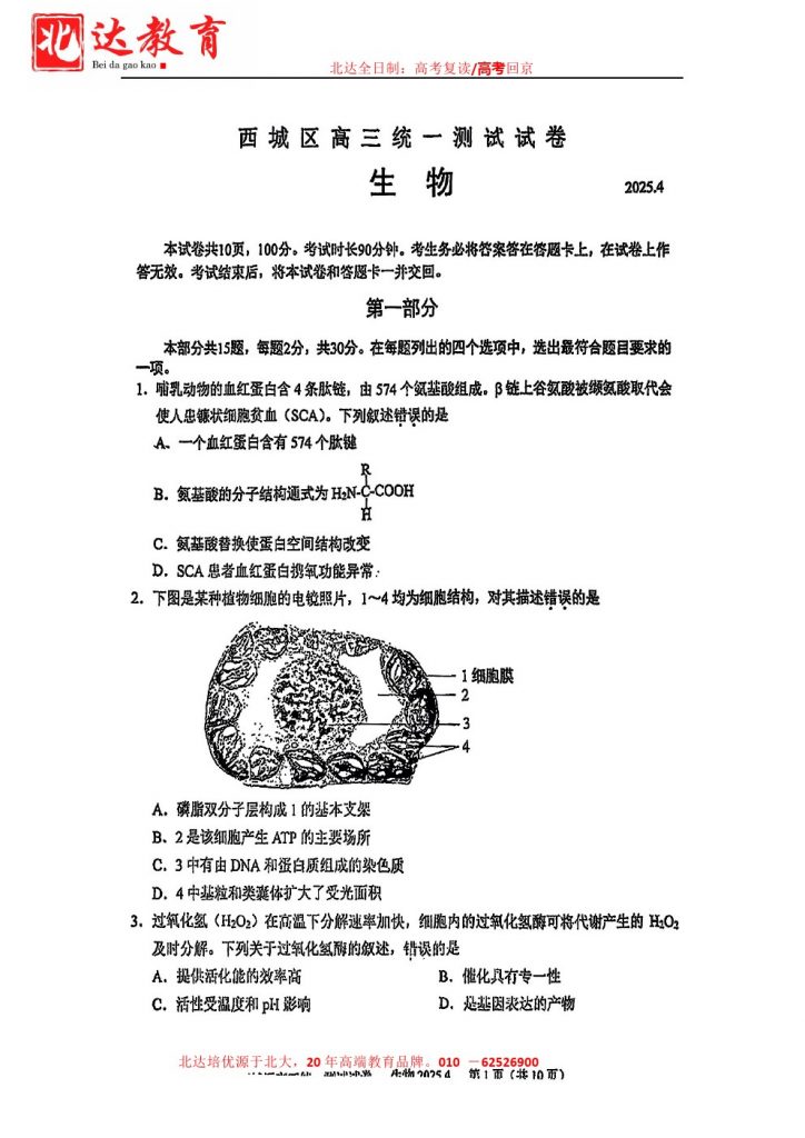 北京2025高三一模正在陆续进行中,为方便大家对答案、下载练习等小编给大家搜集了2025北京西城区高三一模生物试题及答案,需要的小伙伴赶紧下载练习起来吧: 北京北达全日制学校,中高…