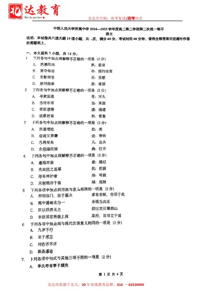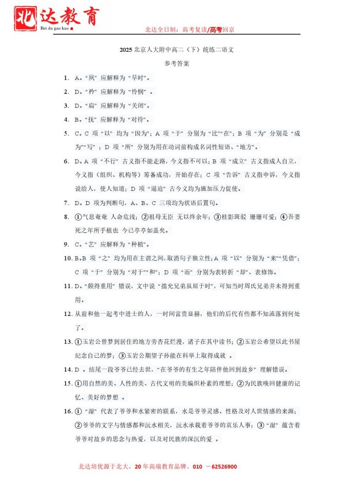 为方便大家对答案、下载练习等小编给大家搜集了人大附中2025高二(下)统练二语文试题及答案,需要的小伙伴赶紧下载练习起来吧: 北京北达全日制学校,中高考复读,外地回京中高考 电话咨…