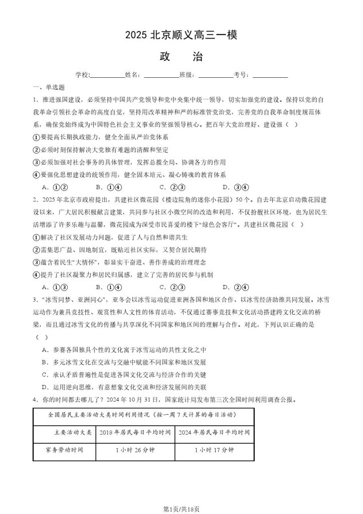 2025北京顺义区高三一模政治试题及答案