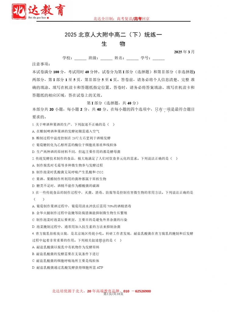 为方便大家对答案、下载练习等小编给大家搜集了2025人大附中高二(下)统练一生物试题及答案,需要的小伙伴赶紧下载练习起来吧: 北京北达全日制学校,中高考复读,外地回京中高考 电话咨…