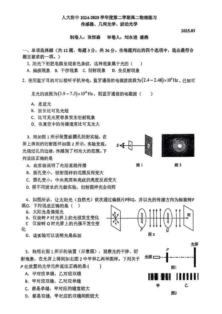 为方便大家对答案、下载练习等小编给大家搜集了人大附中2025高二3月月考物理试题,需要的小伙伴赶紧下载练习起来吧: