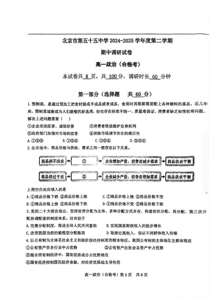 首页 高一资料 2025北京五十五中高一(下)期中政治(合格考)试题