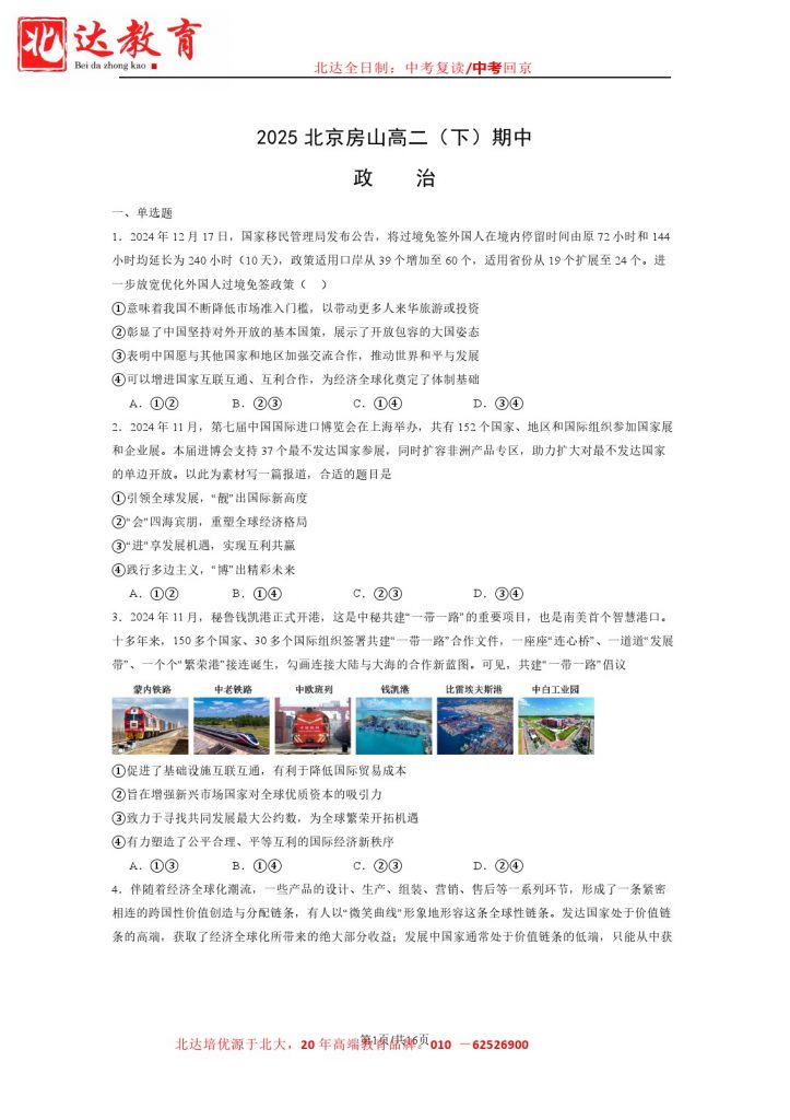 2025北京各区高二期中考已陆续开始,北达教研组整理了2025北房山区高二(下)期中政治试题及答案,分享给大家。