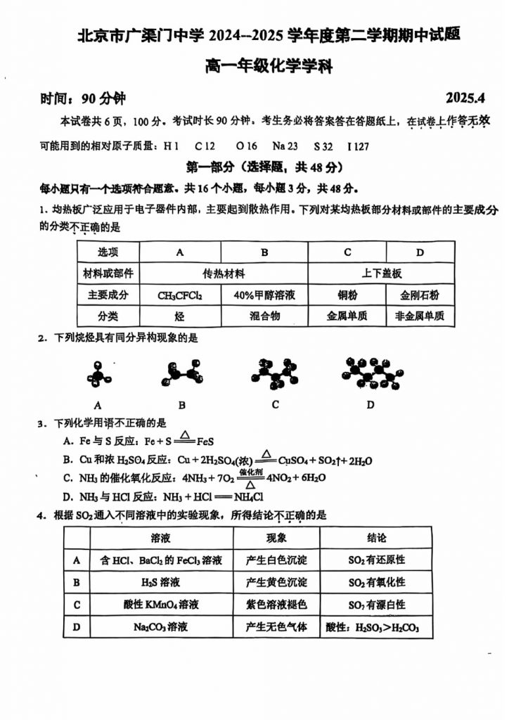2025北京各区高一期中考已陆续开始,北达教研组整理了广渠门中学2025高一(下)期中化学试题,分享给大家。 2025北达高考复读全日制,应届生全日制,外地回京全日制采取择优录取原…