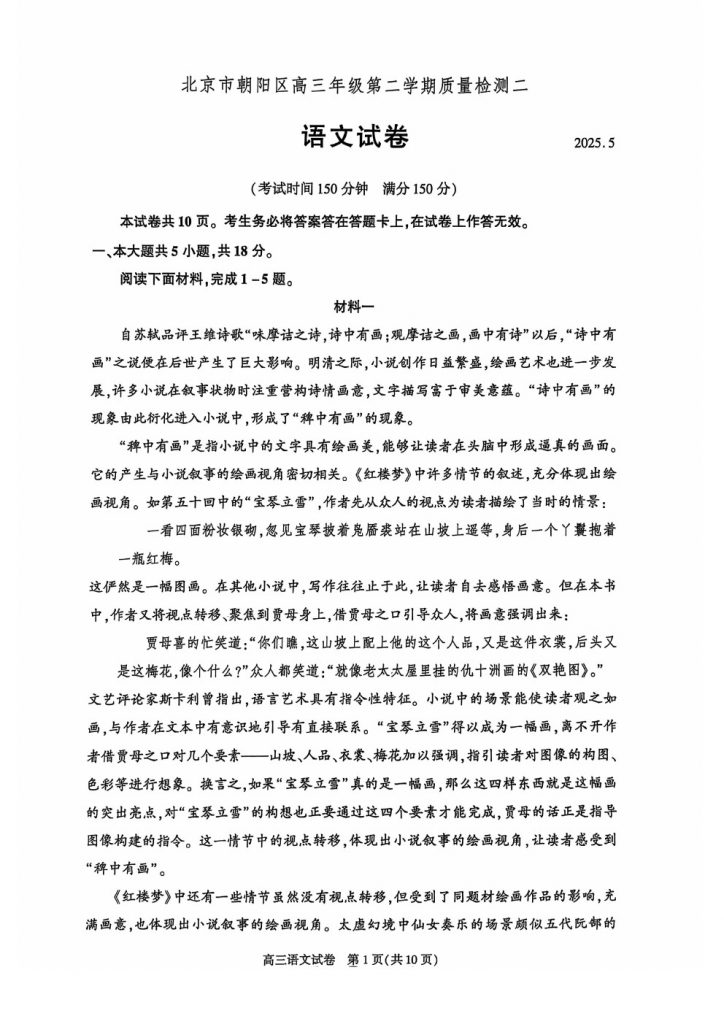 北京2025高三二模正在陆续进行中,为方便大家对答案、下载练习等,小编给大家搜集了北京朝阳区2025高三二模语文试题及答案,需要的小伙伴赶紧下载练习起来吧: