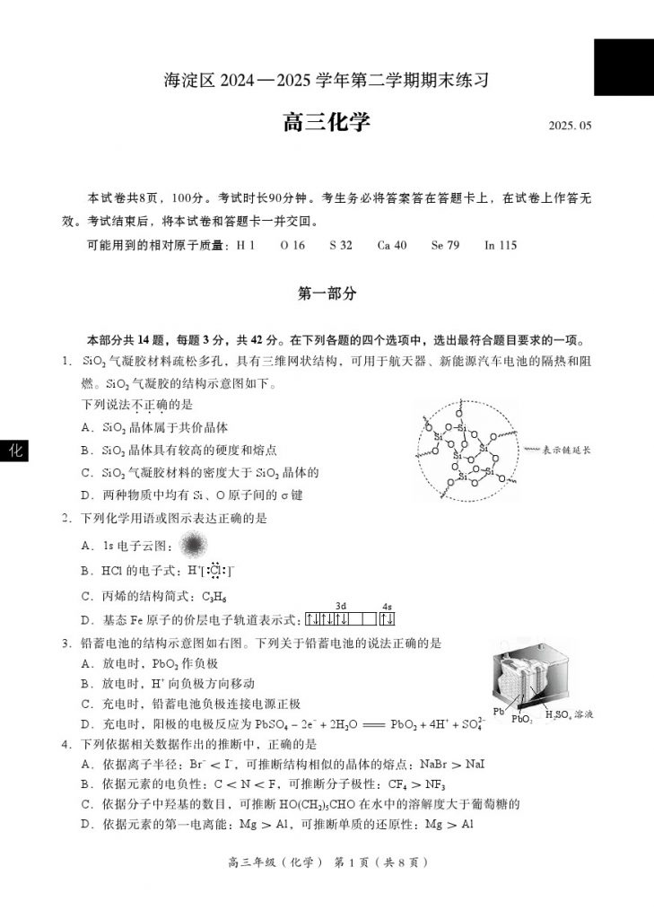 北京2025高三二模正在陆续进行中,为方便大家对答案、下载练习等,小编给大家搜集了2025北京海淀区高三二模化学试题及答案,需要的小伙伴赶紧下载练习起来吧: