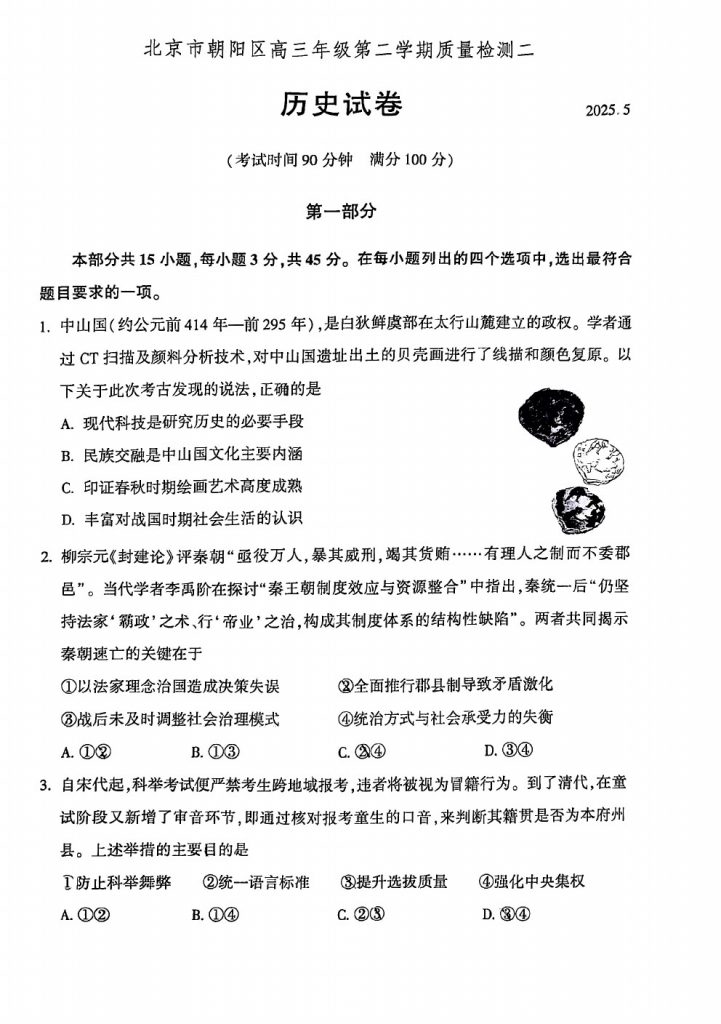 北京2025高三二模正在陆续进行中,为方便大家对答案、下载练习等,小编给大家搜集了2025北京朝阳区高三二模历史试题,需要的小伙伴赶紧下载练习起来吧: