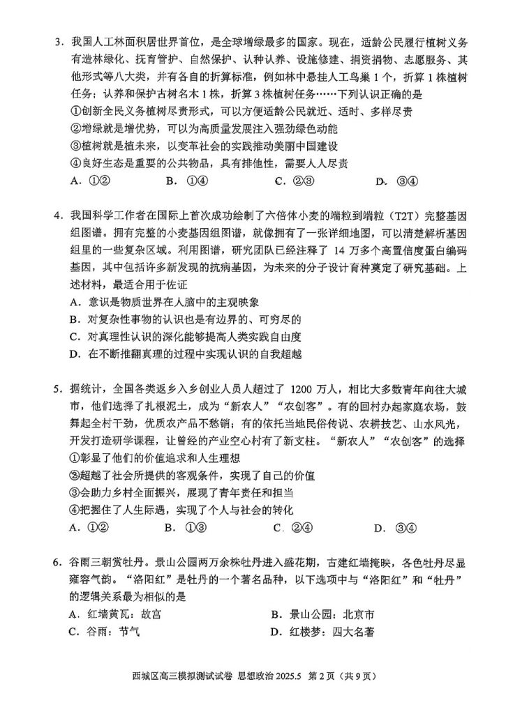 北京2025高三二模正在陆续进行中,为方便大家对答案、下载练习等,小编给大家搜集了2025北京西城区高三二模政治试题及答案,需要的小伙伴赶紧下载练习起来吧: