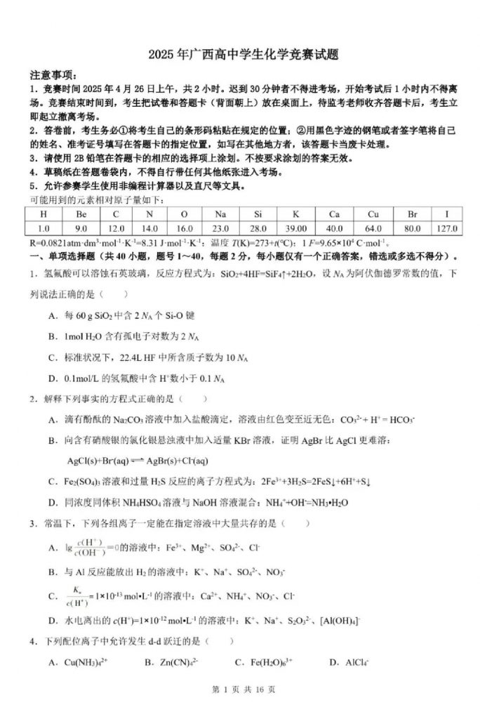 北达高考复读学校整理了2025高中化学奥赛广西预赛试题及答案,供考生参考。