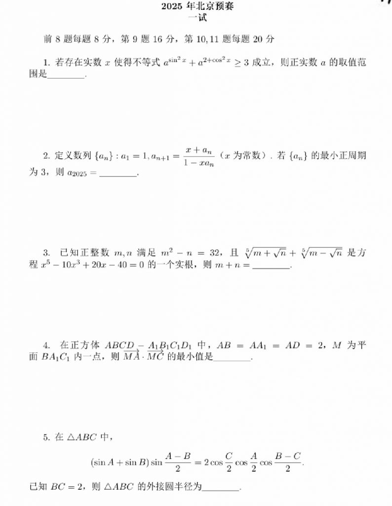 北达高考复读学校整理了2025北京赛区数学竞赛一试试题,供考生参考。