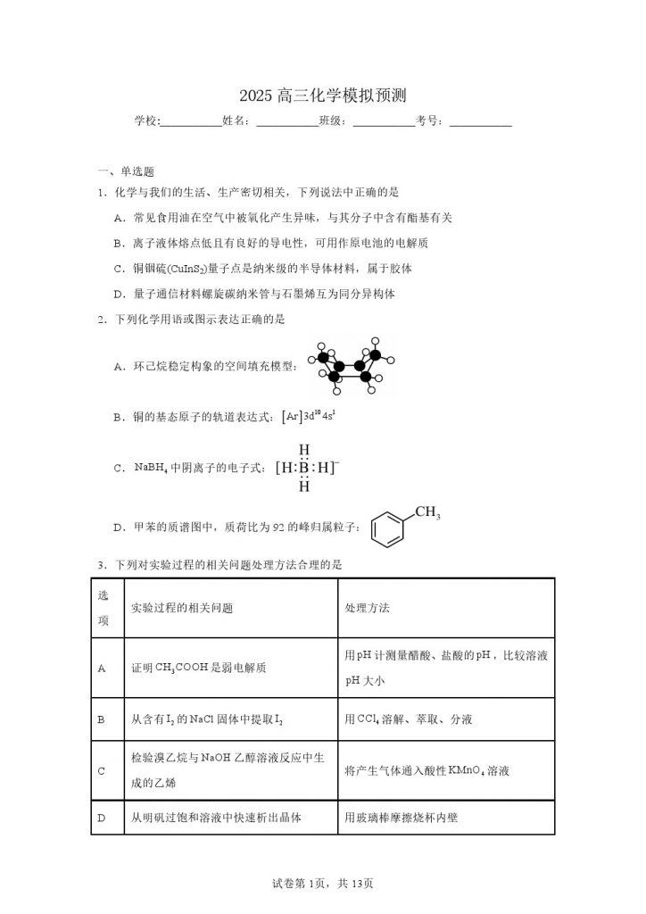 北京部分中学近期陆续进行了高三三模考试,北达高考复读学校整理了北京清华附中2025高三三模化学试题及答案,供考生下载练习。