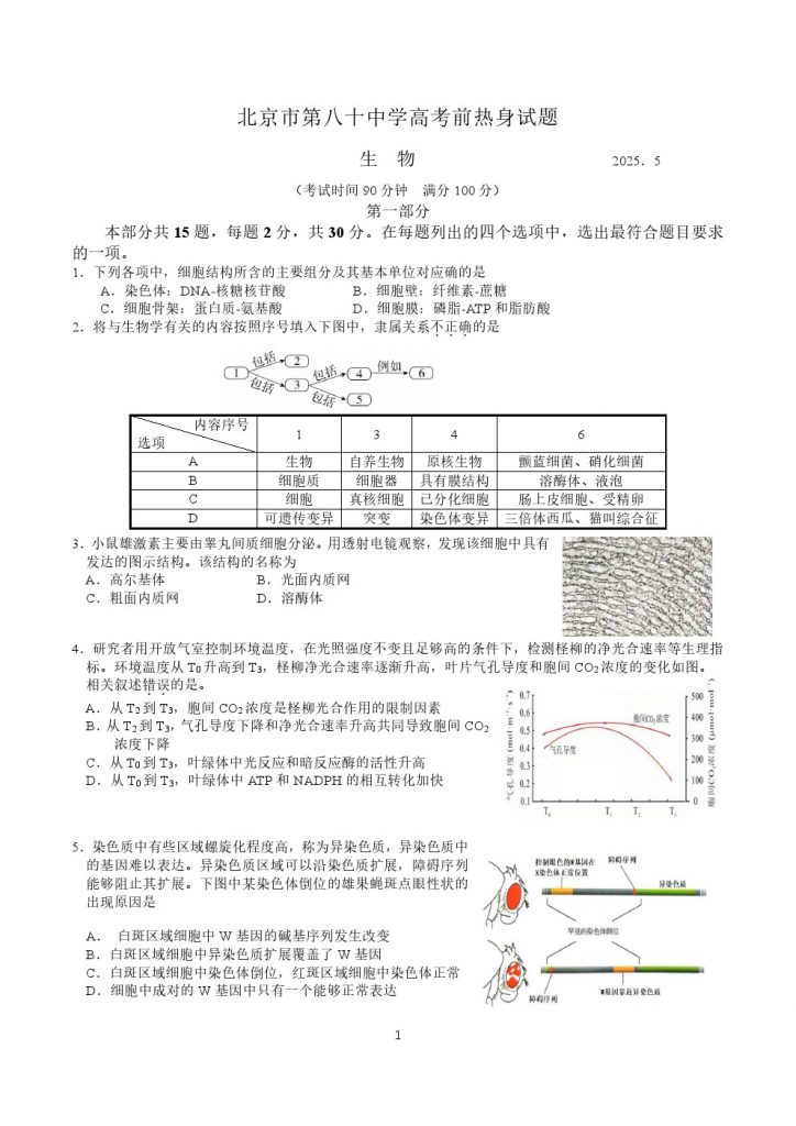 北京部分中学近期陆续进行了高三三模考试,北达高考复读学校整理了八十中2025高三考前热身生物试题及答案,供考生下载练习。