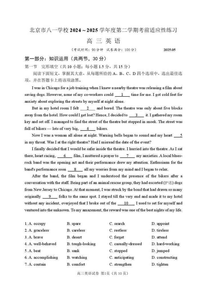北京部分中学近期陆续进行了高三三模考试,北达高考复读学校整理了八一学校2025高三三模英语试题及答案,供考生下载练习。