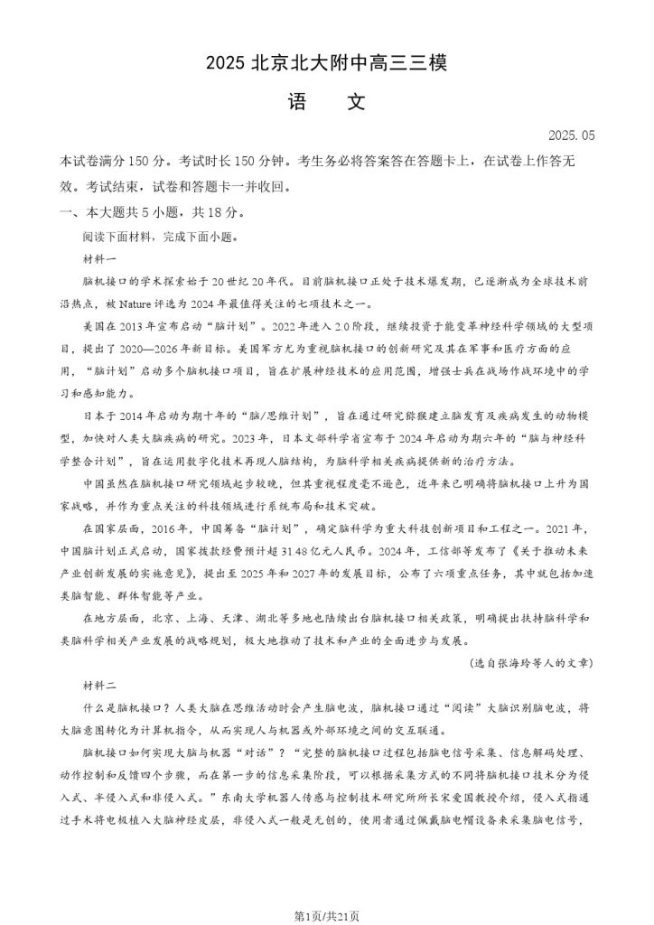 北京部分中学近期陆续进行了高三三模考试,北达高考复读学校整理了北大附中2025年高三三模语文试题及答案,供考生下载练习。