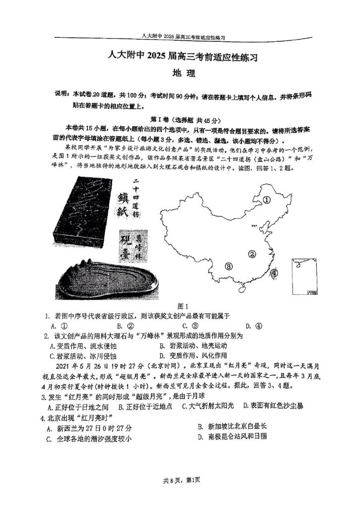 北京部分中学近期陆续进行了高三三模考试,北达高考复读学校整理了人大附中2025年高三三模地理试题及答案,供考生下载练习。 2025北达高考复读全日制,应届生全日制,外地回京全日制采…