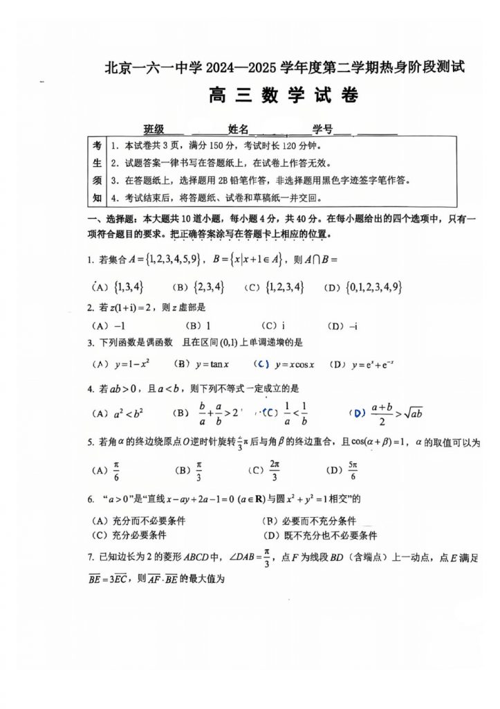 北京部分中学近期陆续进行了高三三模考试,北达高考复读学校整理了北京一六一中2025高三三模数学试题,供考生下载练习。