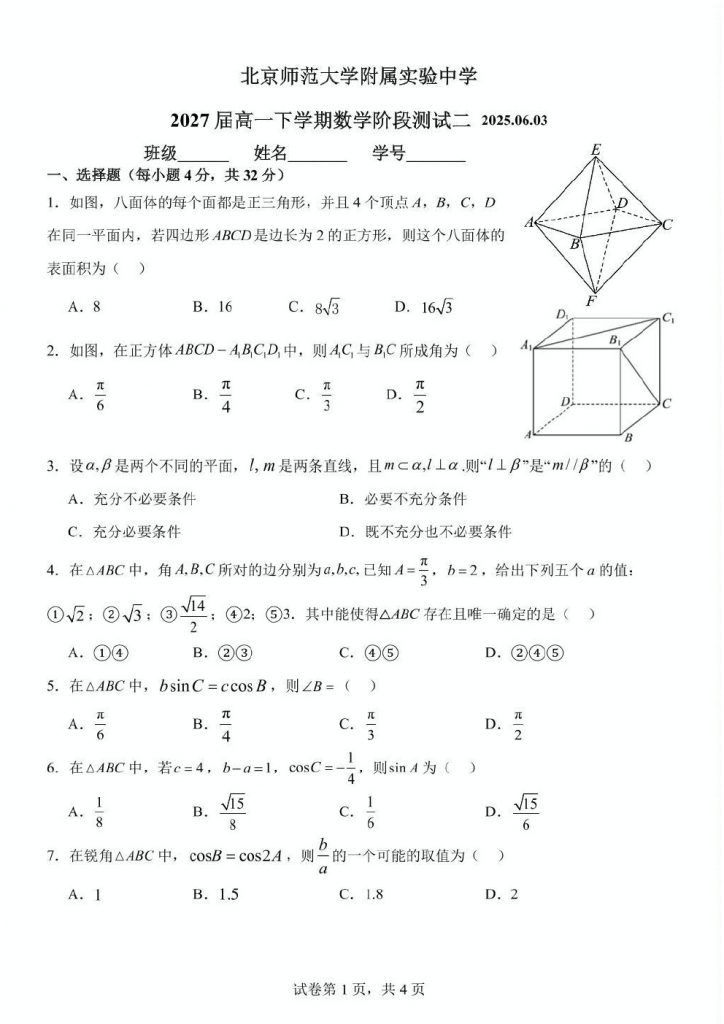 2025年北京各中学高一6月月考已结束,小编整理了2025北京北师大实验中学高一6月月考数学试题及答案,分享给大家。