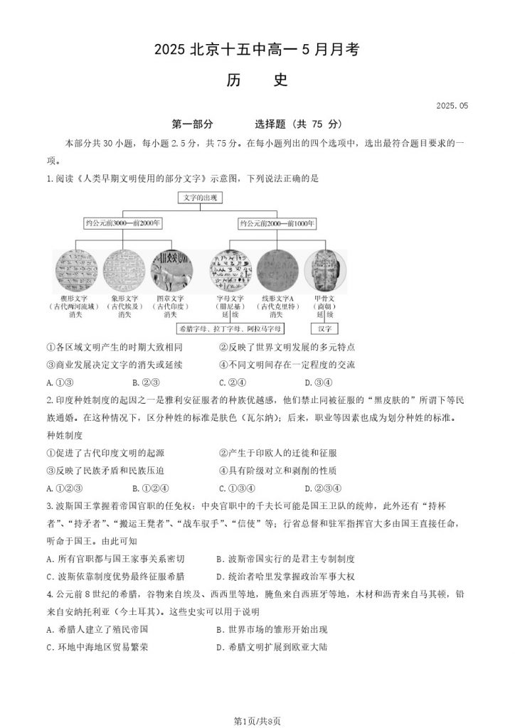 2025年北京各中学高一6月月考已结束,小编整理了北京十五中2025年高一5月月考历史试题及答案,分享给大家。