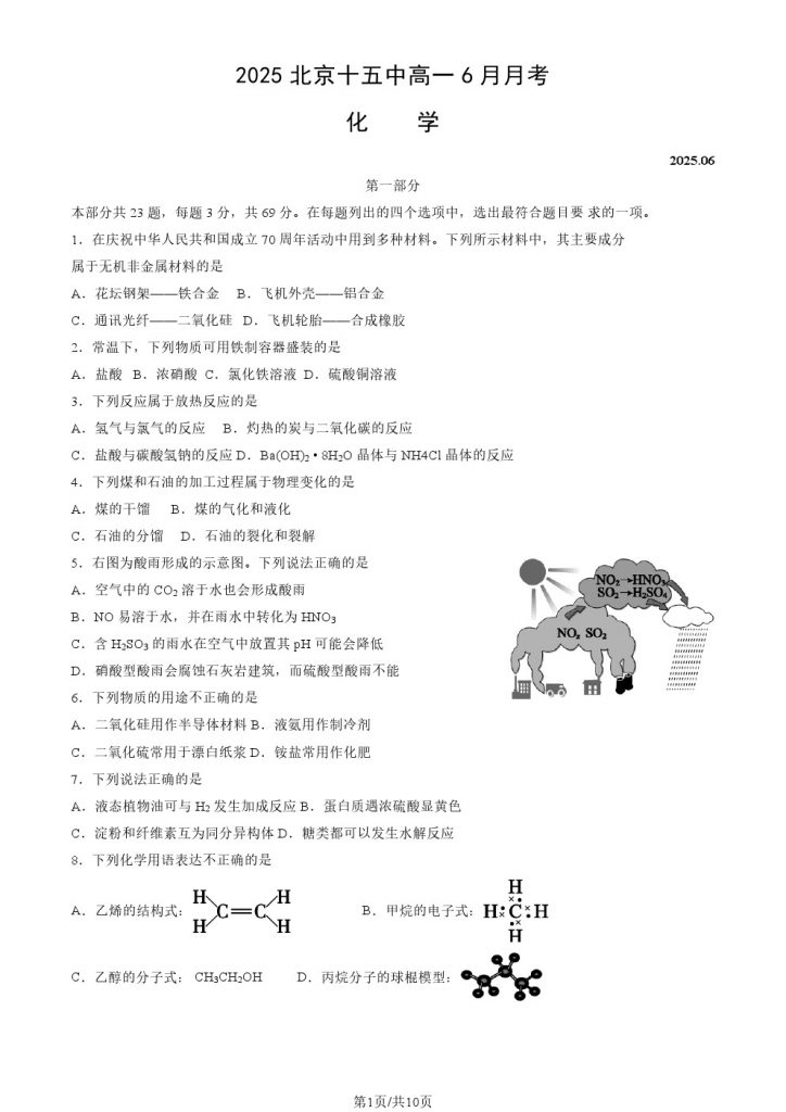 2025年北京各中学高一6月月考已结束,小编整理了北京十五中2025年高一6月月考化学试题及答案,分享给大家。