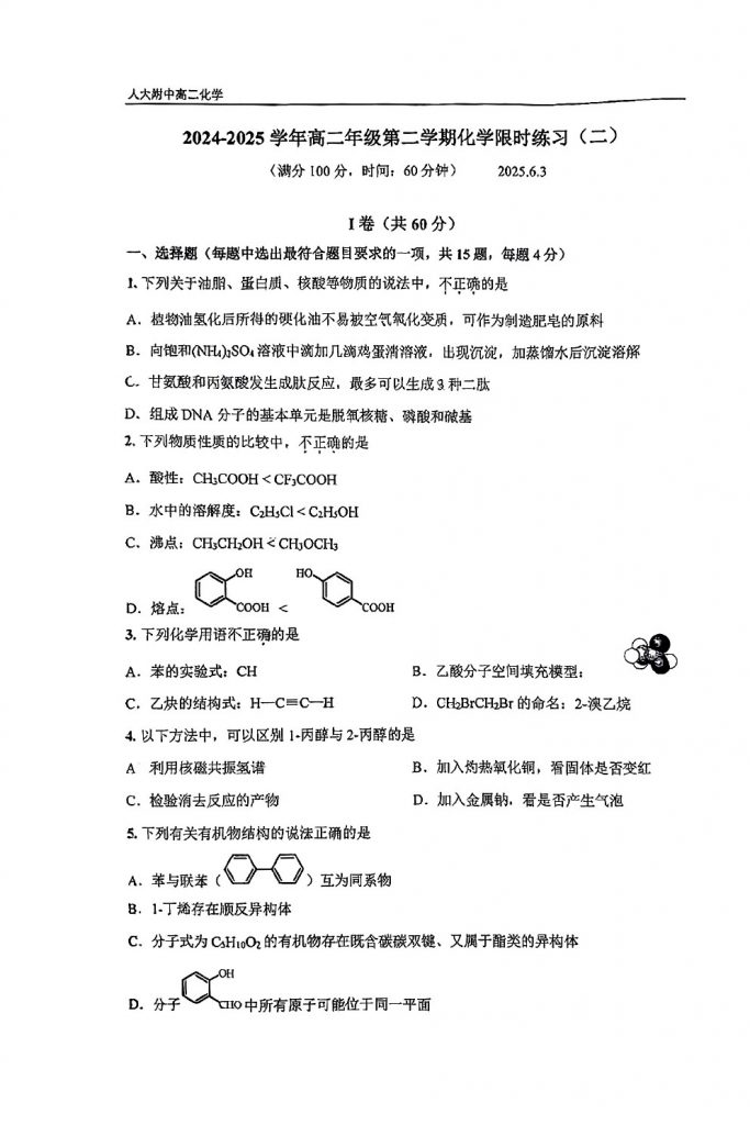2025年北京各中学高二6月月考已陆续进行中,小编整理了2025人大附中高二6月月考化学试题及答案,分享给大家。