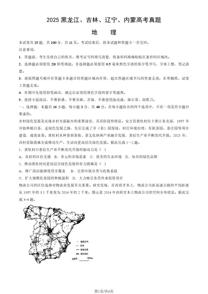 2025(黑吉辽内)高考地理真题及答案