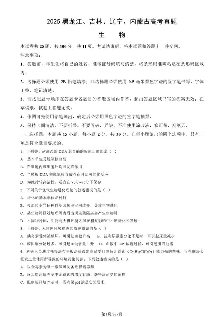2025年全国各省市高考考试已结束,北达教研组整理了2025(黑吉辽内)高考生物真题,详情如下: