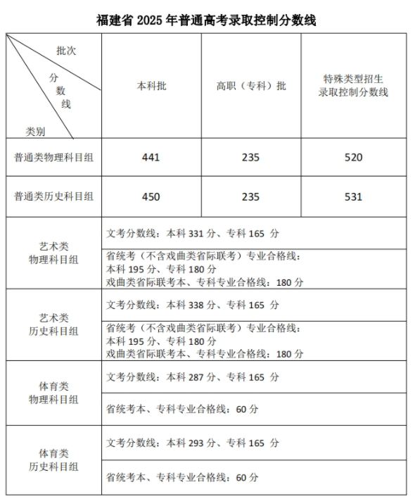 6月24日下午,福建省高等学校招生委员会召开全体会议,研究确定我省2025年普通高考切线方案,部署高招录取工作。经会议研究决定,福建省2025年普通高考各类录取控制分数线具体如下: