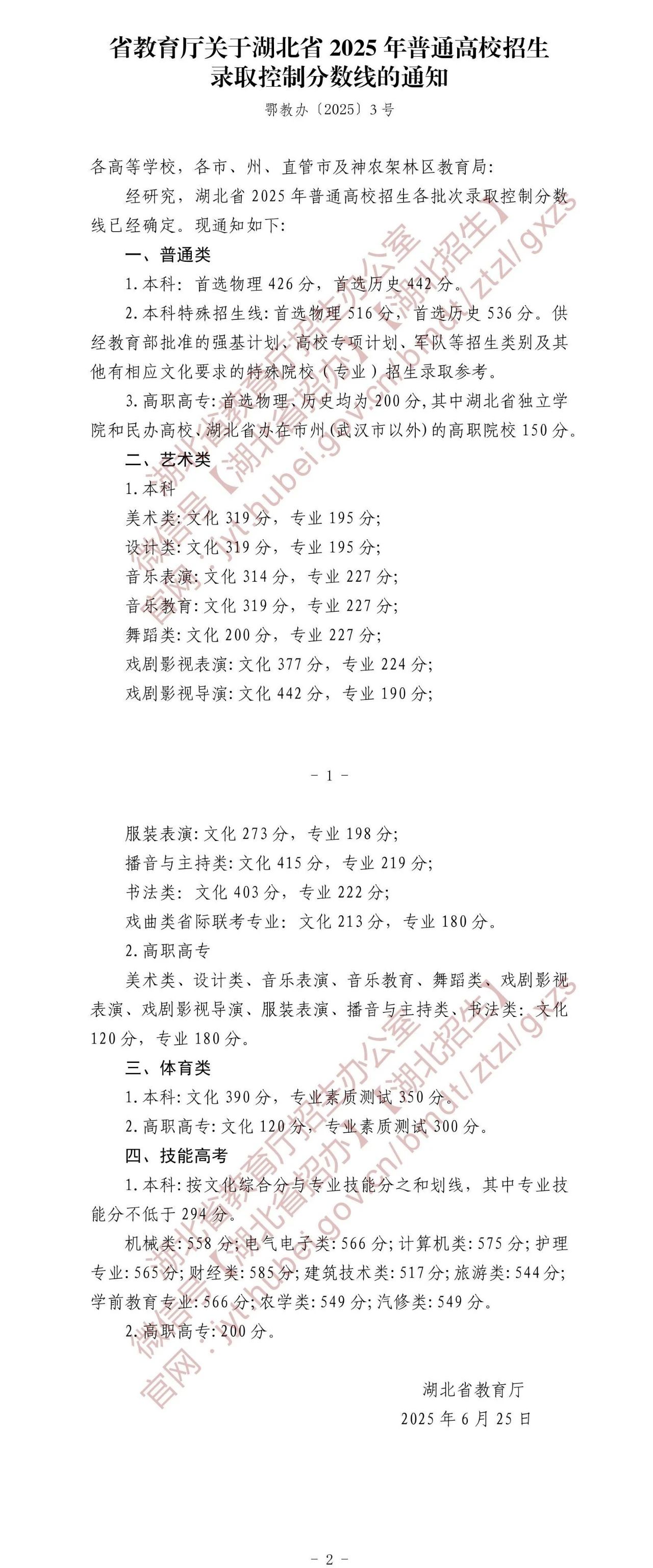 2025湖北高考本科录取控制分数线出炉,北达教研组整理了2025湖北高考本科录取控制分数线,希望各位考生都可以查到满意的成绩:
