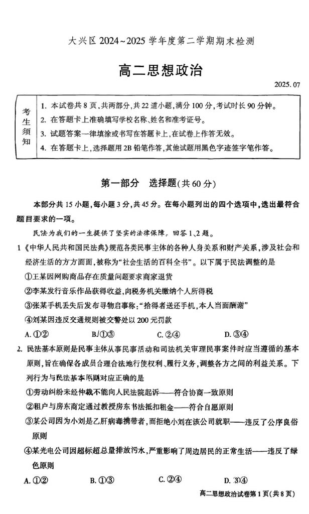 2025年北京各区高二(下)期末考已陆续开始进行,北达教研组整理了北京大兴2025年高二(下)期末政治试题及答案,分享给大家。