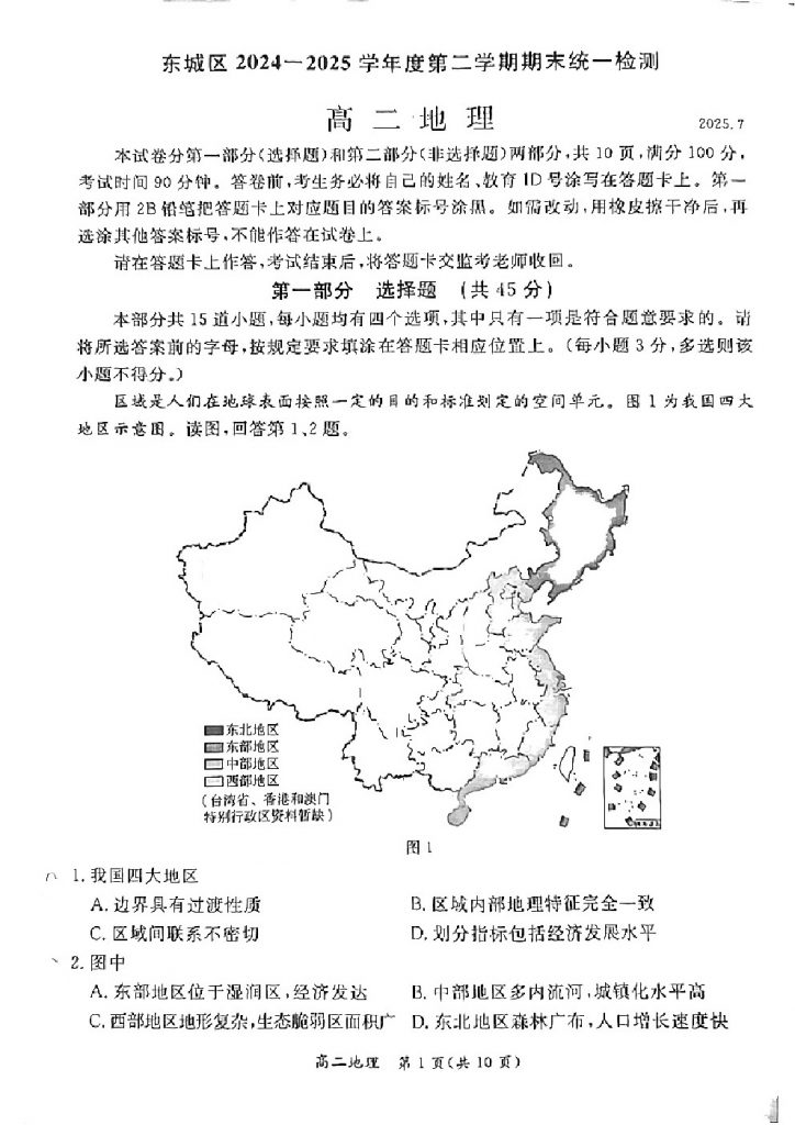 2025年北京各区高二(下)期末考已陆续开始进行,北达教研组整理了2025北京东城区高二(下)期末地理试题及答案,分享给大家。