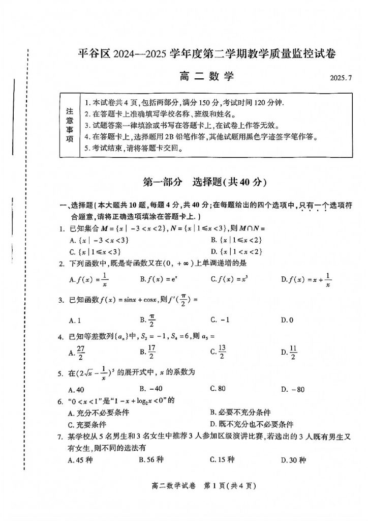 2025年北京各区高二(下)期末考已陆续开始进行,北达教研组整理了2025北京平谷区高二(下)期末数学试题,分享给大家。