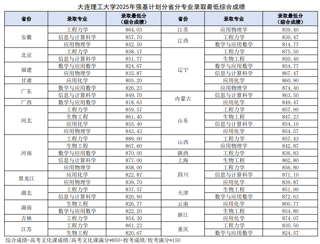 根据教育部《关于在部分高校开展基础学科招生改革试点工作的意见》(教学〔2020〕1号)等文件要求,按照《大连理工大学2025年强基计划招生简章》有关规定,通过组织专家面试,经学校研究同意,现发布我校2025年强基计划分省分专业录取最低综合成绩。