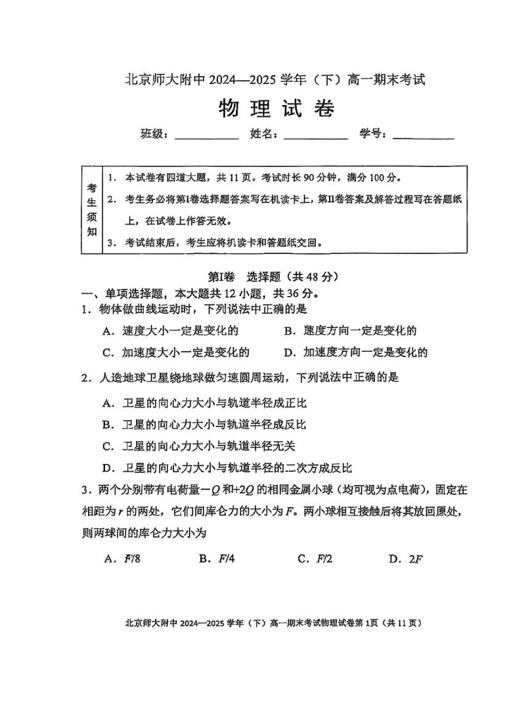 2025年北京各区高一(下)期末考已陆续开始进行,北达教研组整理了2025北京北师大附中高一(下)期末物理试题,分享给大家。 2025北达高考复读全日制,应届生全日制,外地回京全日…