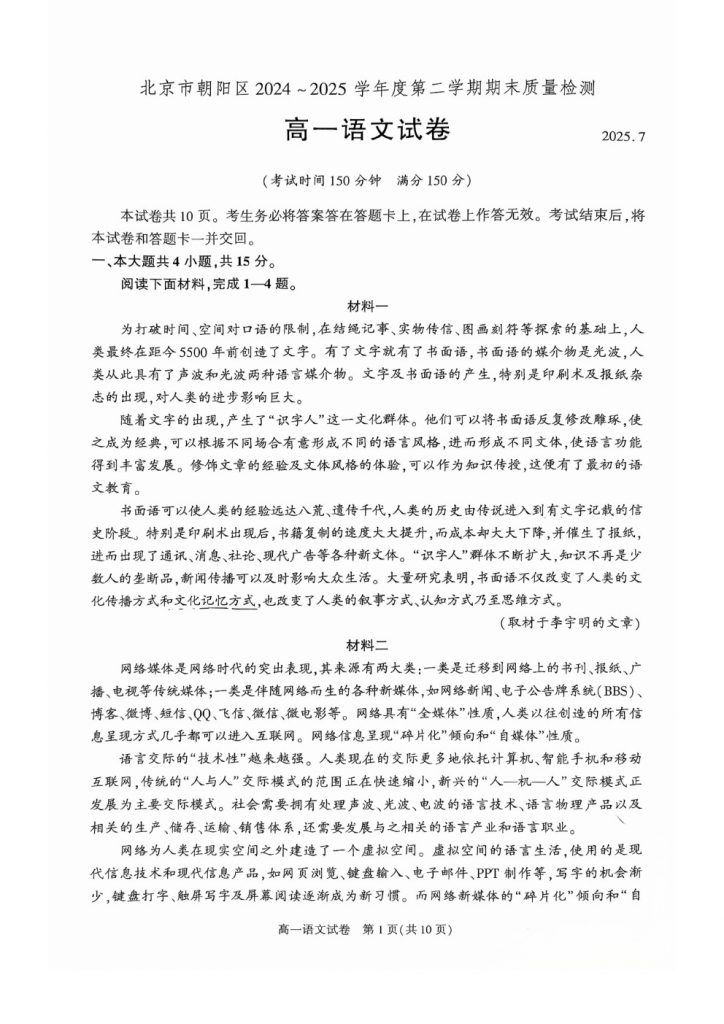 首页 高一资料 2025北京朝阳高一(下)期末语文试题