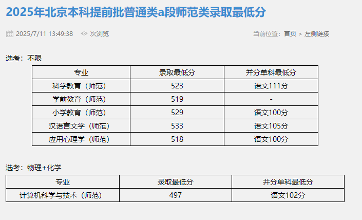 北京联合大学2025在京本科提前批普通A段师范类录取分数
