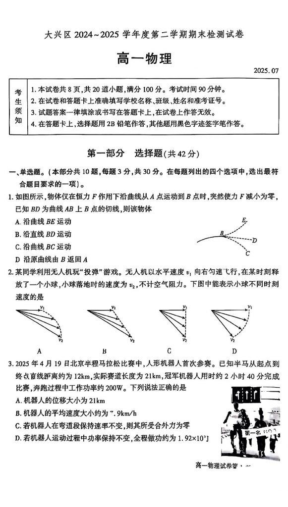 2025年北京各区高一(下)期末考已陆续开始进行,北达教研组整理了2025北京大兴高一(下)期末物理试题,分享给大家。