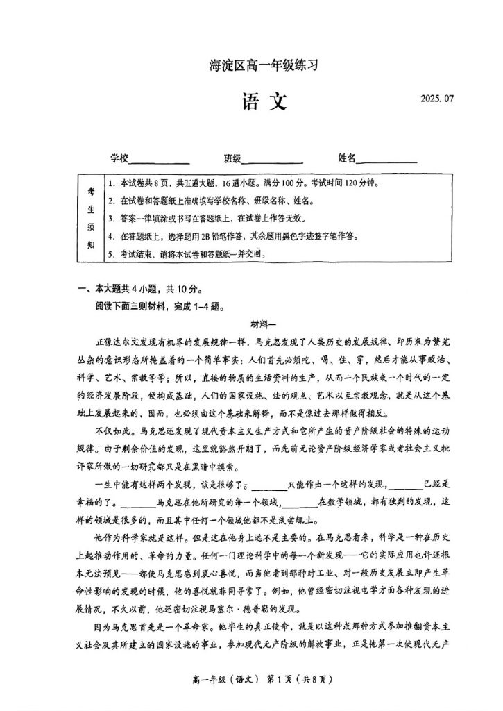 2025北京海淀高一(下)期末语文试题及答案