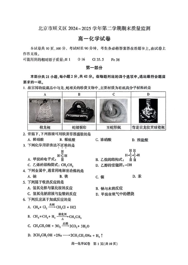 2025年北京各区高一(下)期末考已陆续开始进行,北达教研组整理了2025北京顺义高一(下)期末化学试题,分享给大家。
