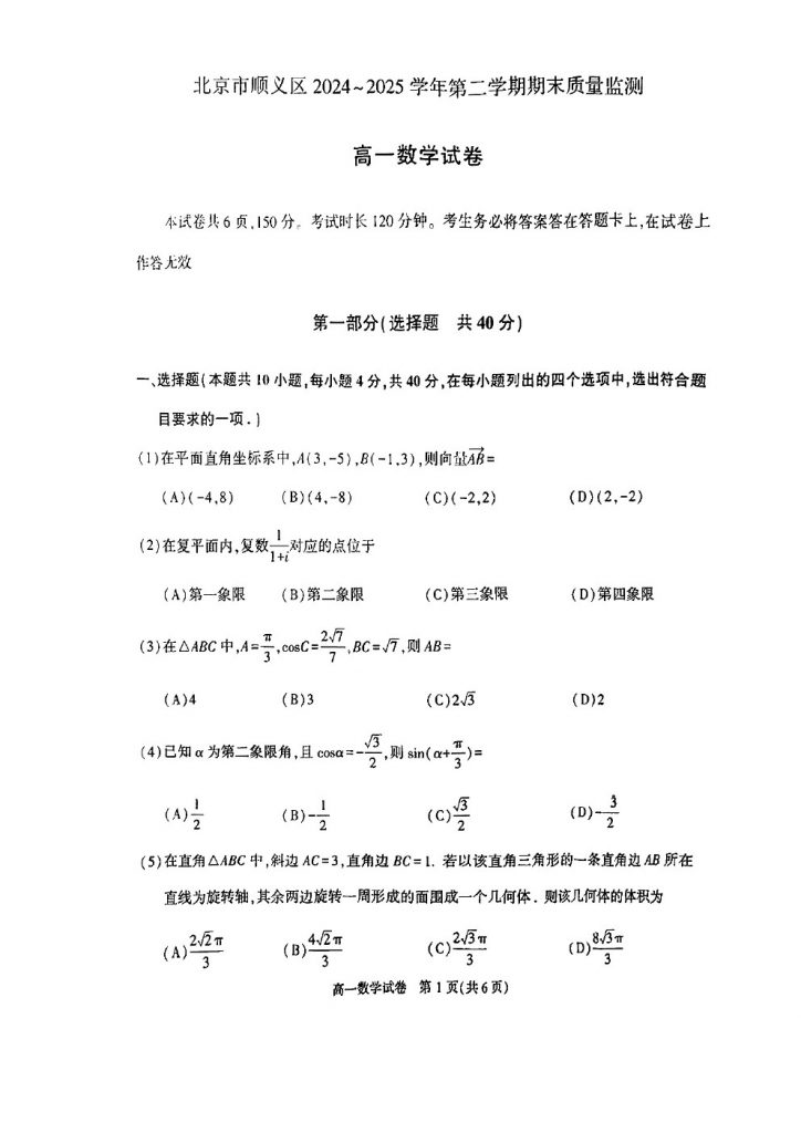 首页 高一资料 2025北京顺义高一(下)期末数学试题
