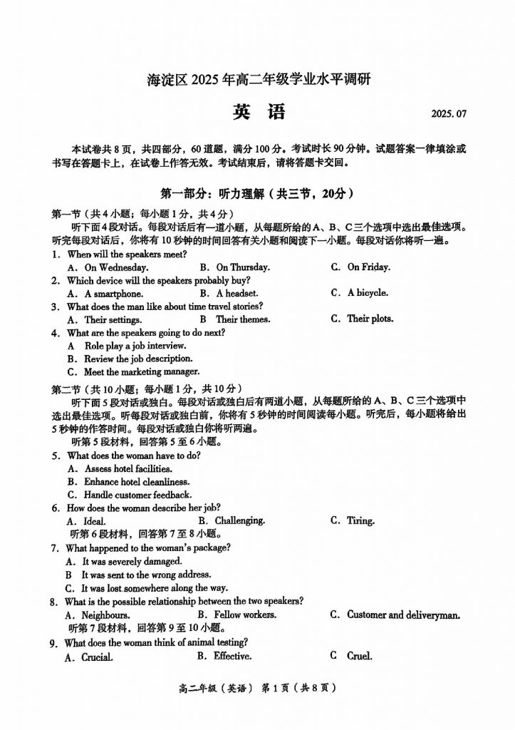 首页 高二资料 2025北京海淀高二(下)期末英语试题及答案