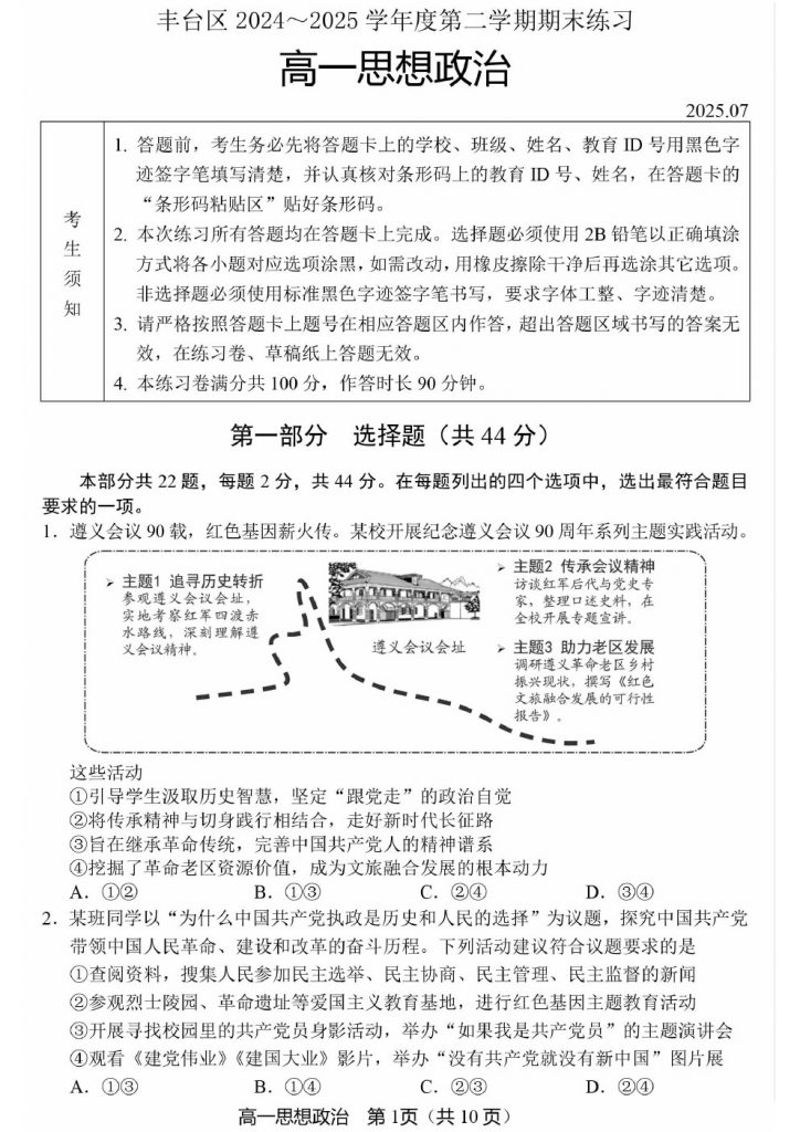 2025年北京各区高一(下)期末考已陆续开始进行,北达教研组整理了2025北京丰台高一(下)期末政治答案,分享给大家。