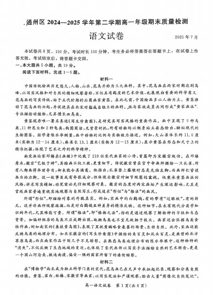 首页 高一资料 2025北京通州高一(下)期末语文试题及答案