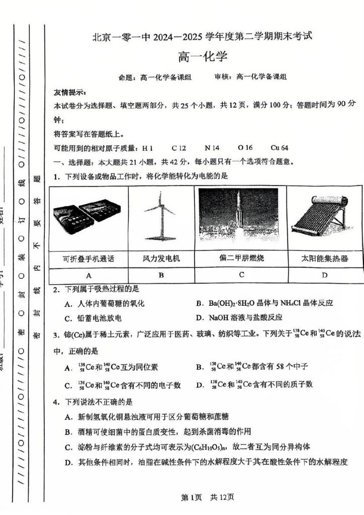 2025年北京各区高一(下)期末考已陆续开始进行,北达教研组整理了2025北京一零一中高一(下)期末化学试题及答案,分享给大家。