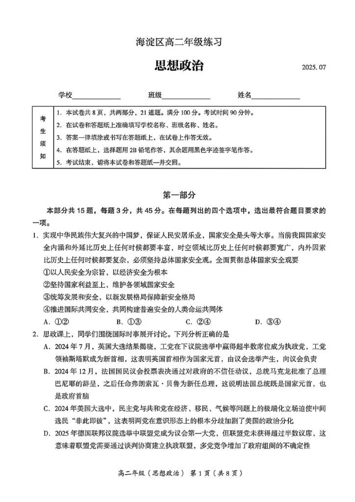 2025年北京各区高二(下)期末考已陆续开始进行,北达教研组整理了2025北京海淀高二(下)期末政治试题及答案,分享给大家。