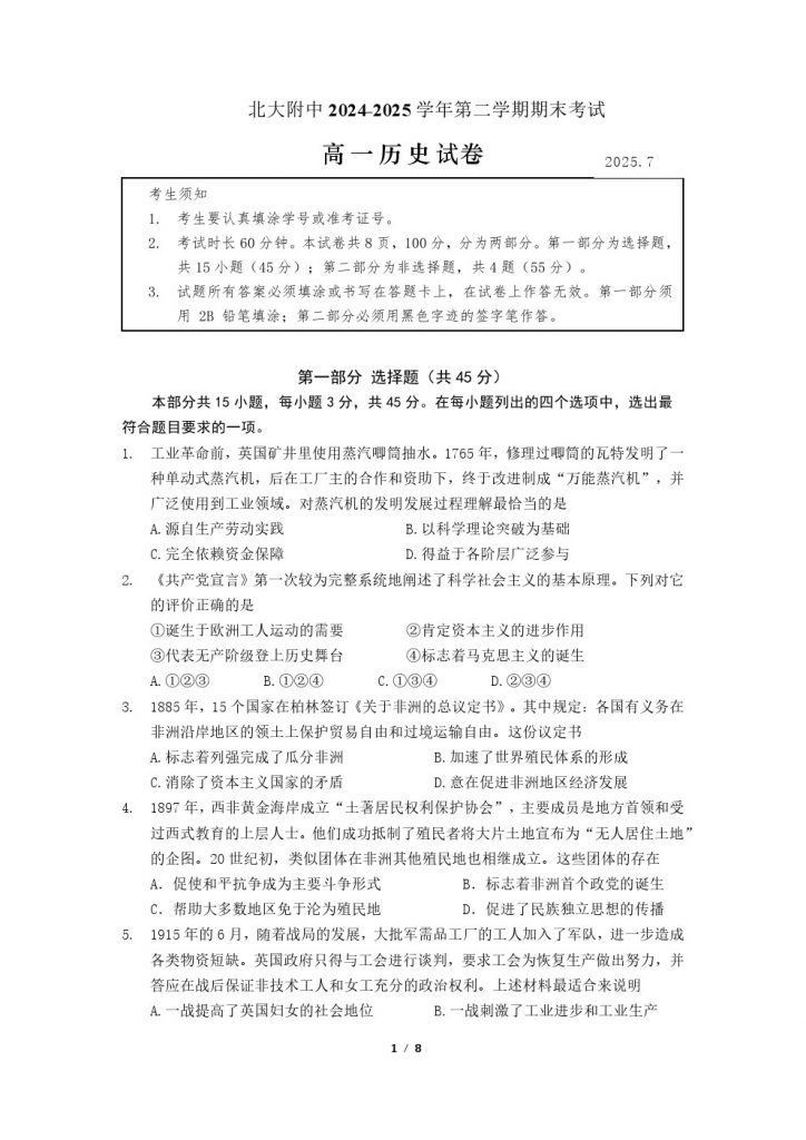 2025年北京各区高一(下)期末考已陆续开始进行,北达教研组整理了2025北京北大附中高一(下)期末历史试题及答案,分享给大家。
