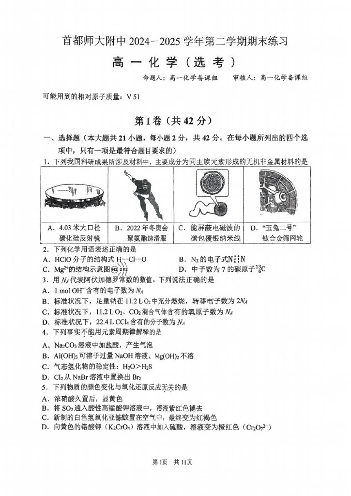 2025北京首都师大附中高一(下)期末化学试题及答案