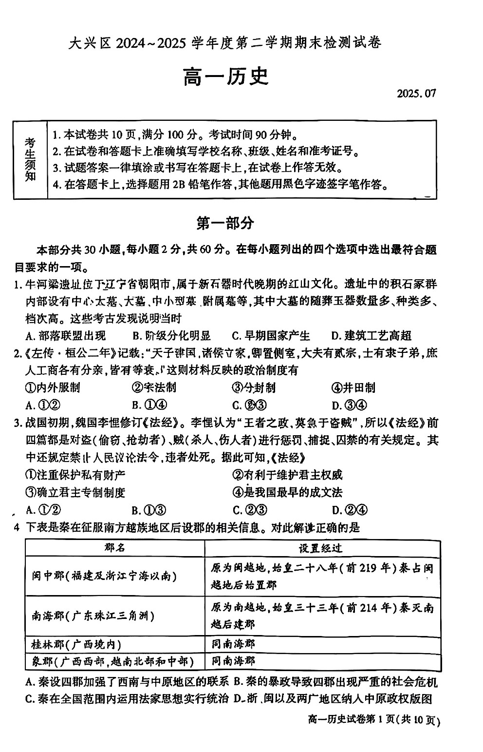 2025年北京各区高一(下)期末考已陆续开始进行,北达教研组整理了2025北京大兴高一(下)期末历史试题及答案,分享给大家。