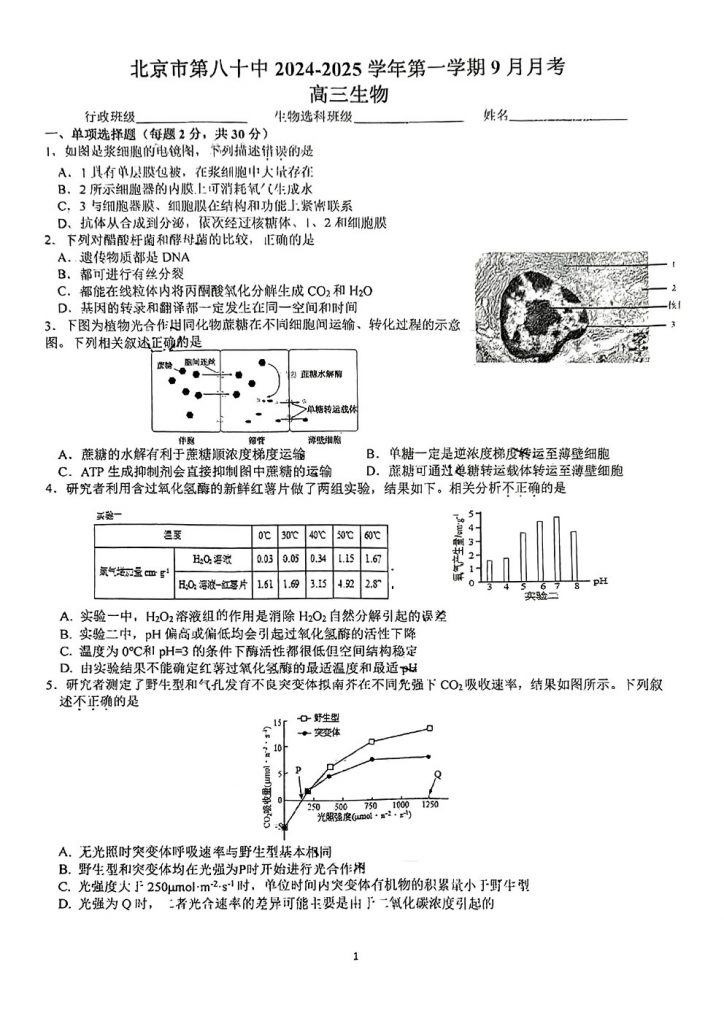 北达教研组整理了2024北京八十中高三(上)开学考生物试题,看看都考了哪些内容?