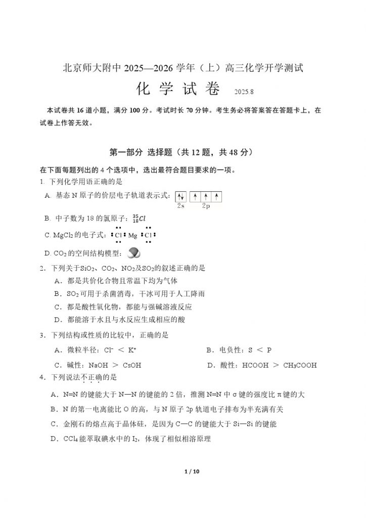 北达教研组整理了2025北京北师大附中高三(上)开学考化学试题,看看都考了哪些内容?